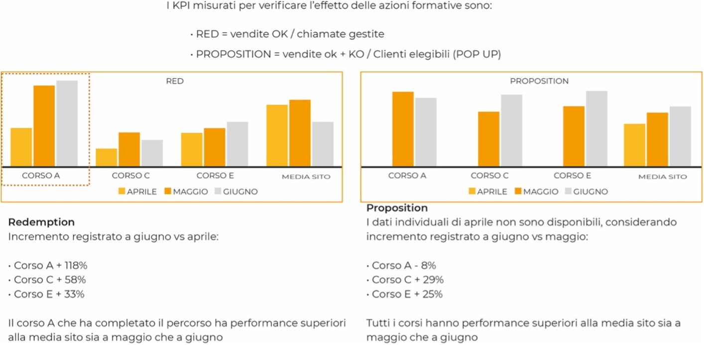 Per quanto concerne il KPI di Redemption, abbiamo potuto notare come il corso A abbia ottenuto risultati notevolmente superiori +118% rispetto al corso C e E (+58% e +33%) rimasti indietro per tematiche legate all’arrivo delle chiamate.